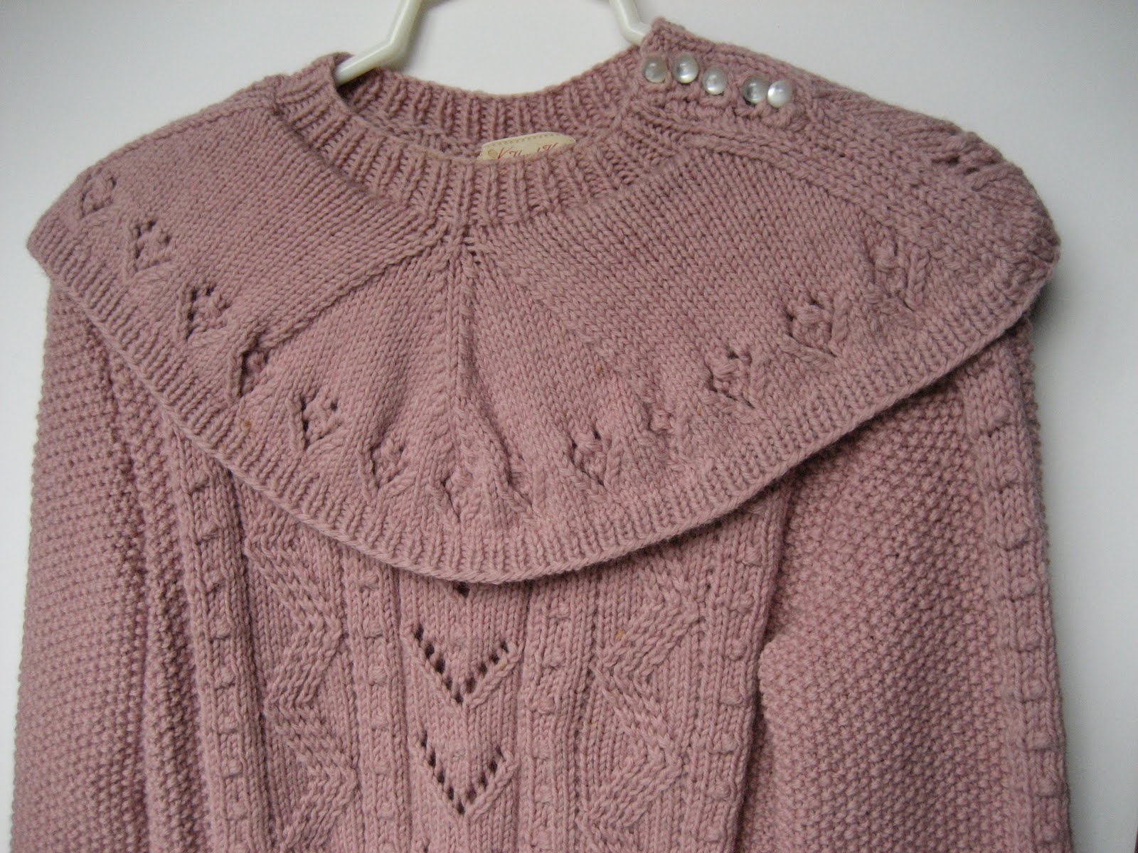 I have worn the pink sweater only a handful of times. It is truely lovely, but has a very wide collar, or a very wide sort-of-a-collar-thing.